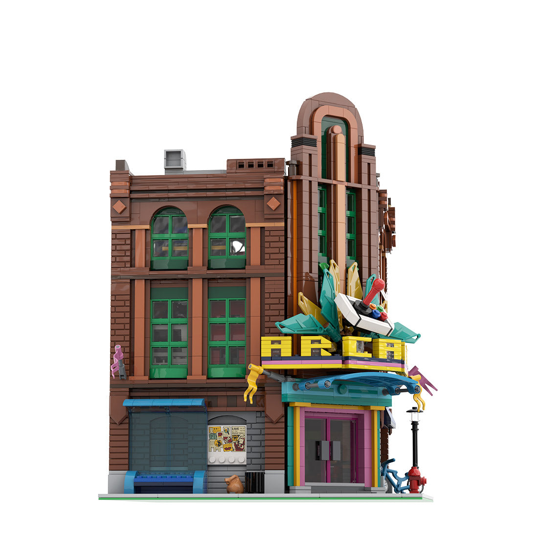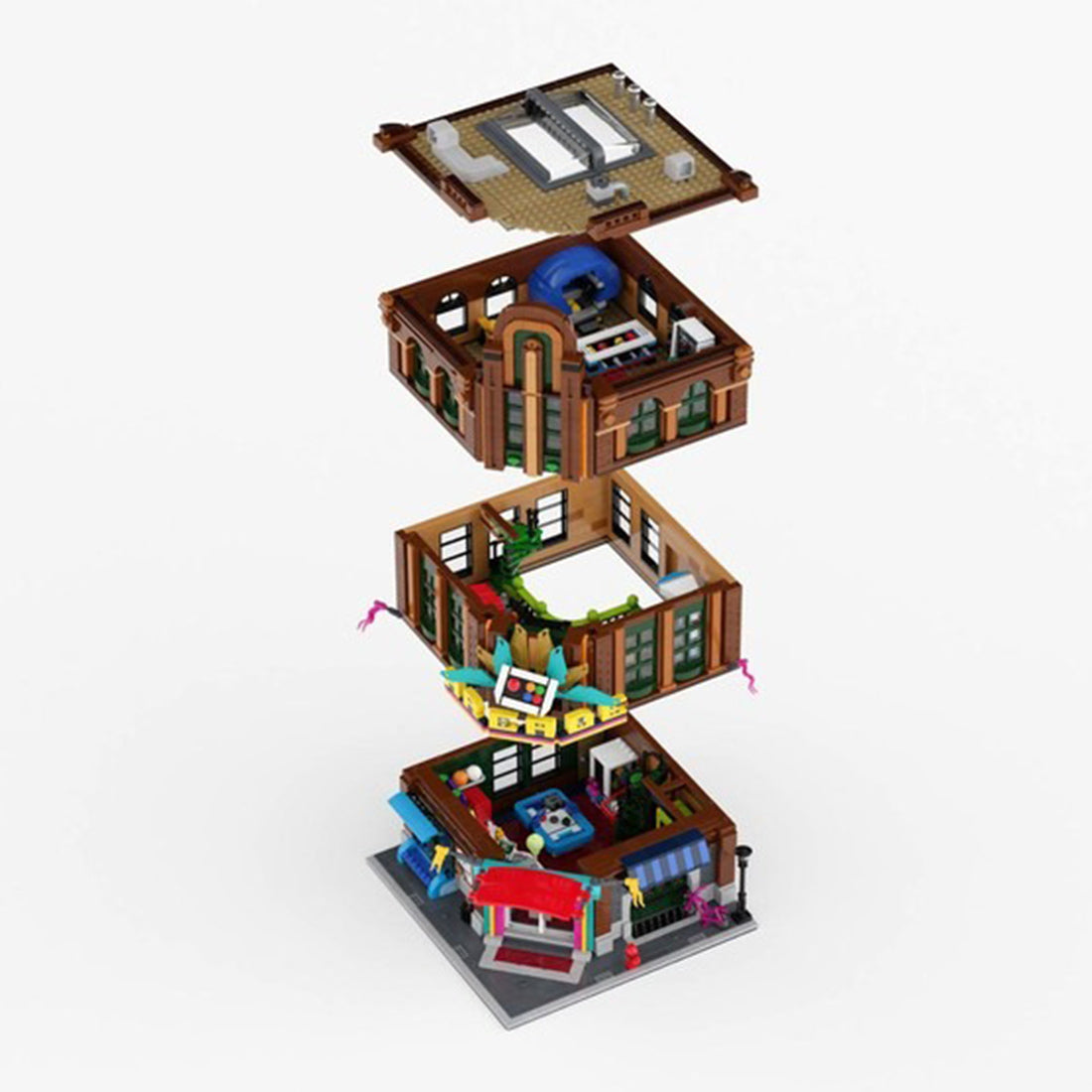 Bring the excitement of the 80s to life with this modular design of a classic video game arcade. The building features a mix of modern and older architecture, with an original brick façade, an awning out front, and a bus stop on the curb. Experience the thrill of the arcade with detailed features throughout, including a colourful decoration above the entrance and a huge video game joystick.